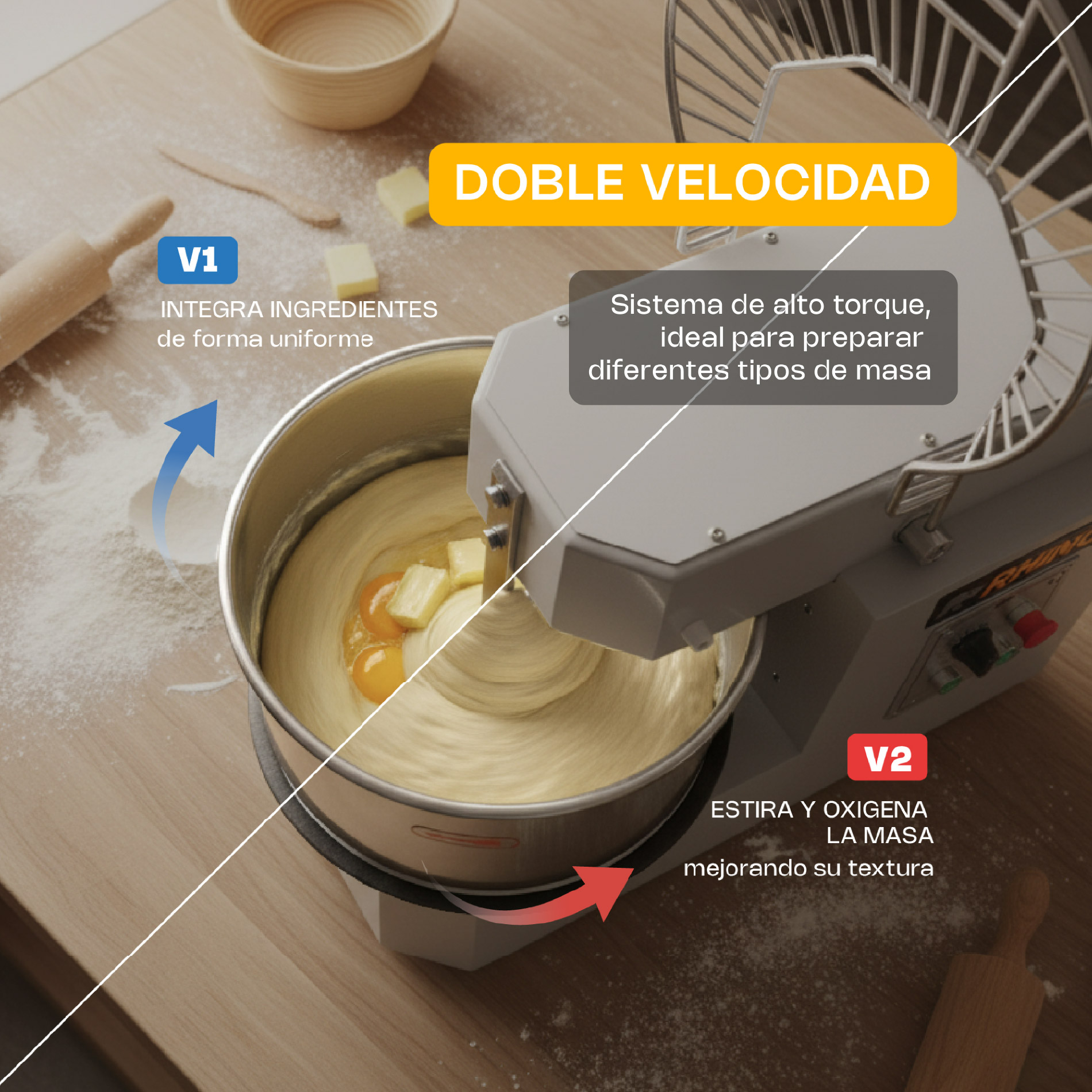 • Doble velocidad de amasado: V1 (baja): integra uniformemente los ingrediente, V2 (alta): estira y oxigena la masa, logrando una textura perfecta.
