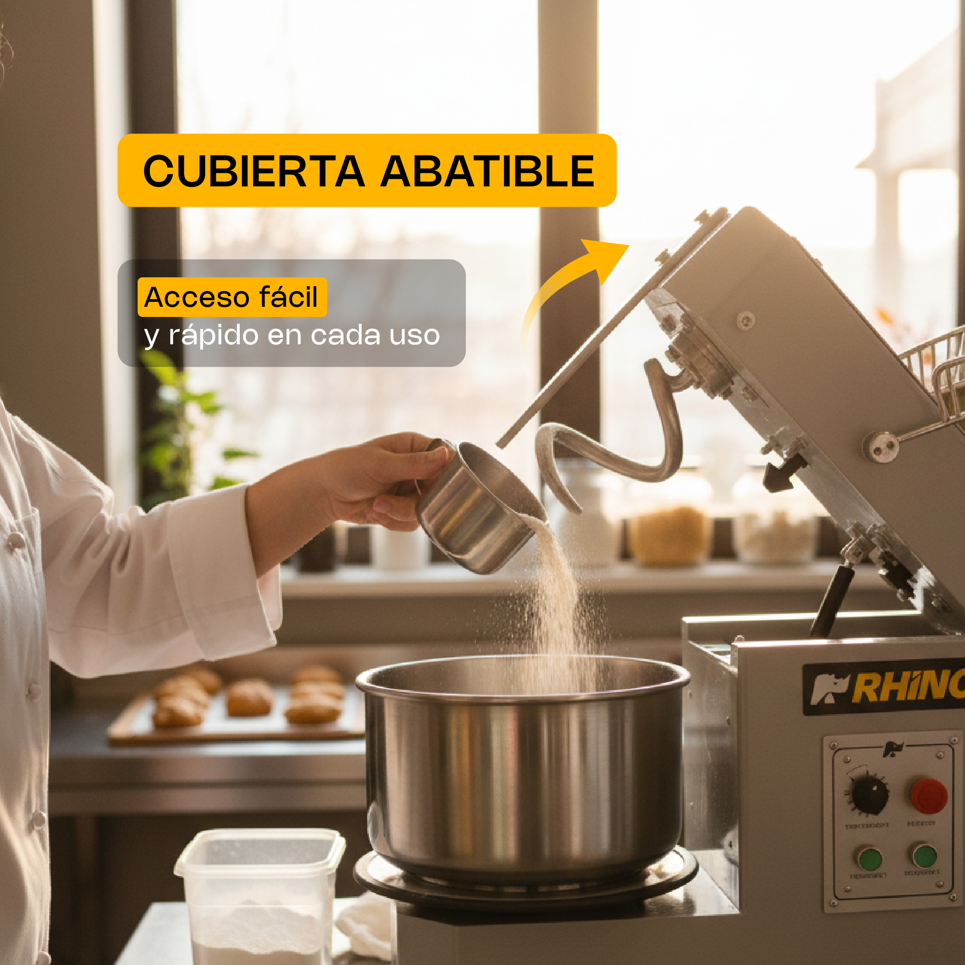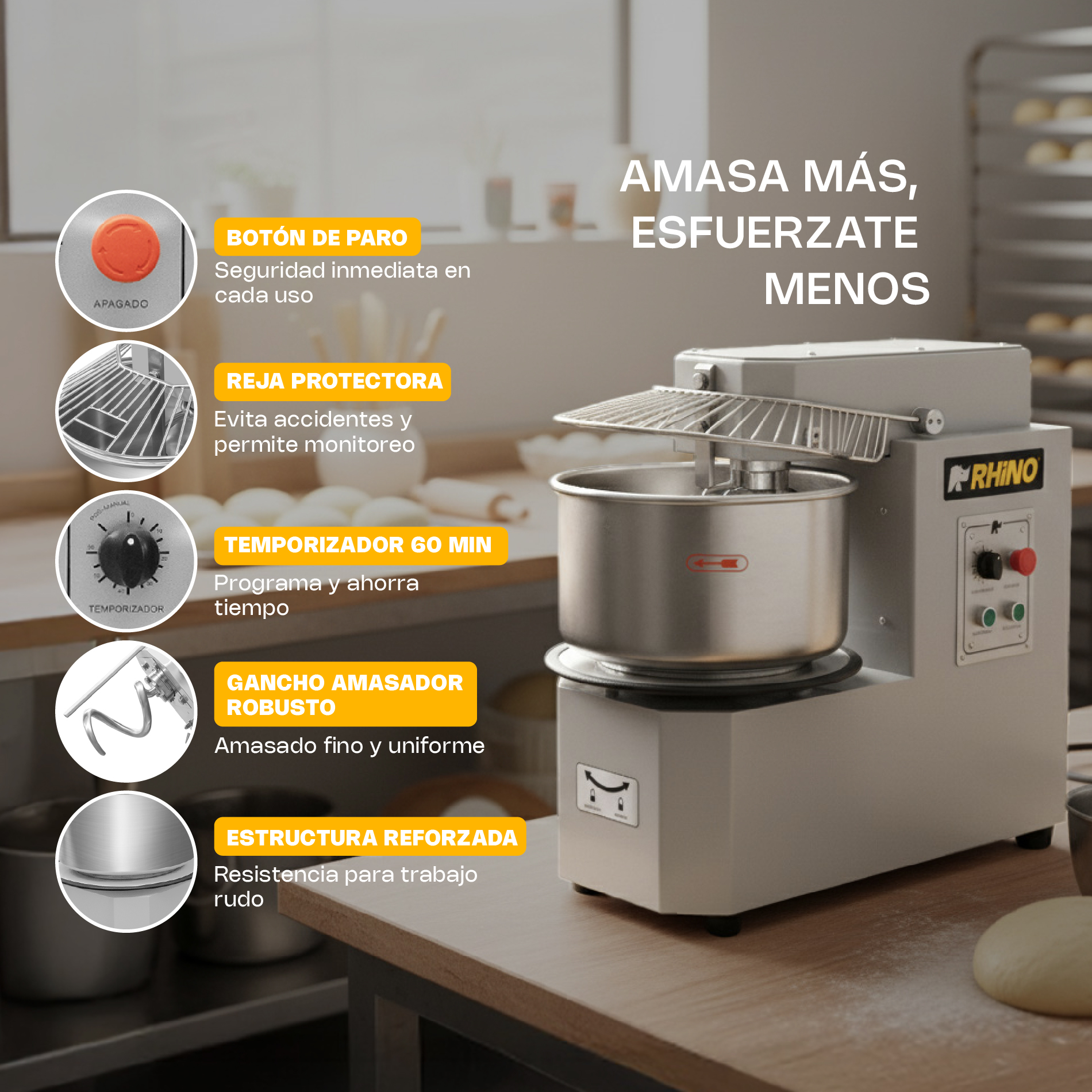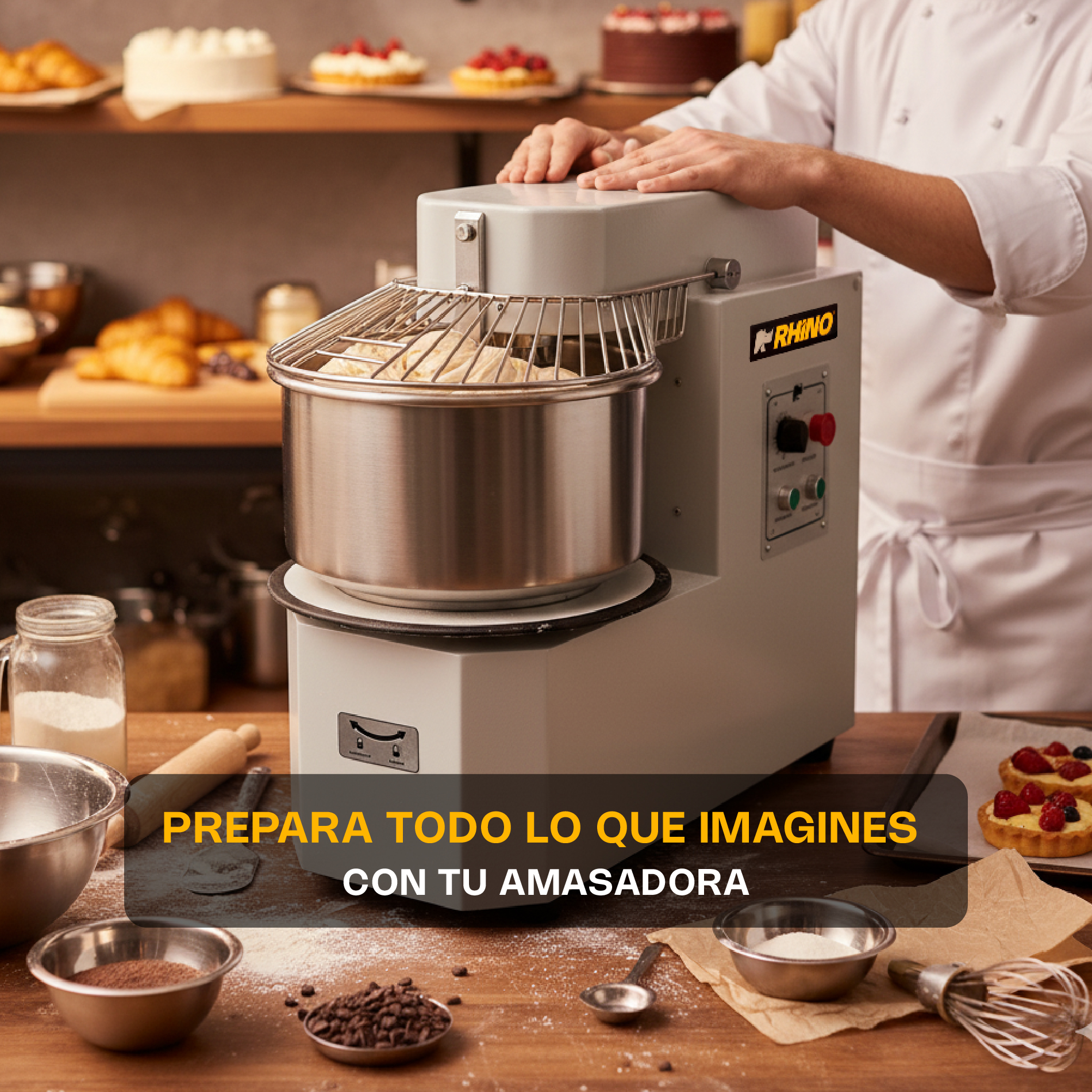 Diseñada para panaderías, pastelerías y negocios que requieren un trabajo intenso y prolongado, la AMASA-20PRO de Rhino es la solución ideal para obtener una masa de calidad superior en cada preparación.