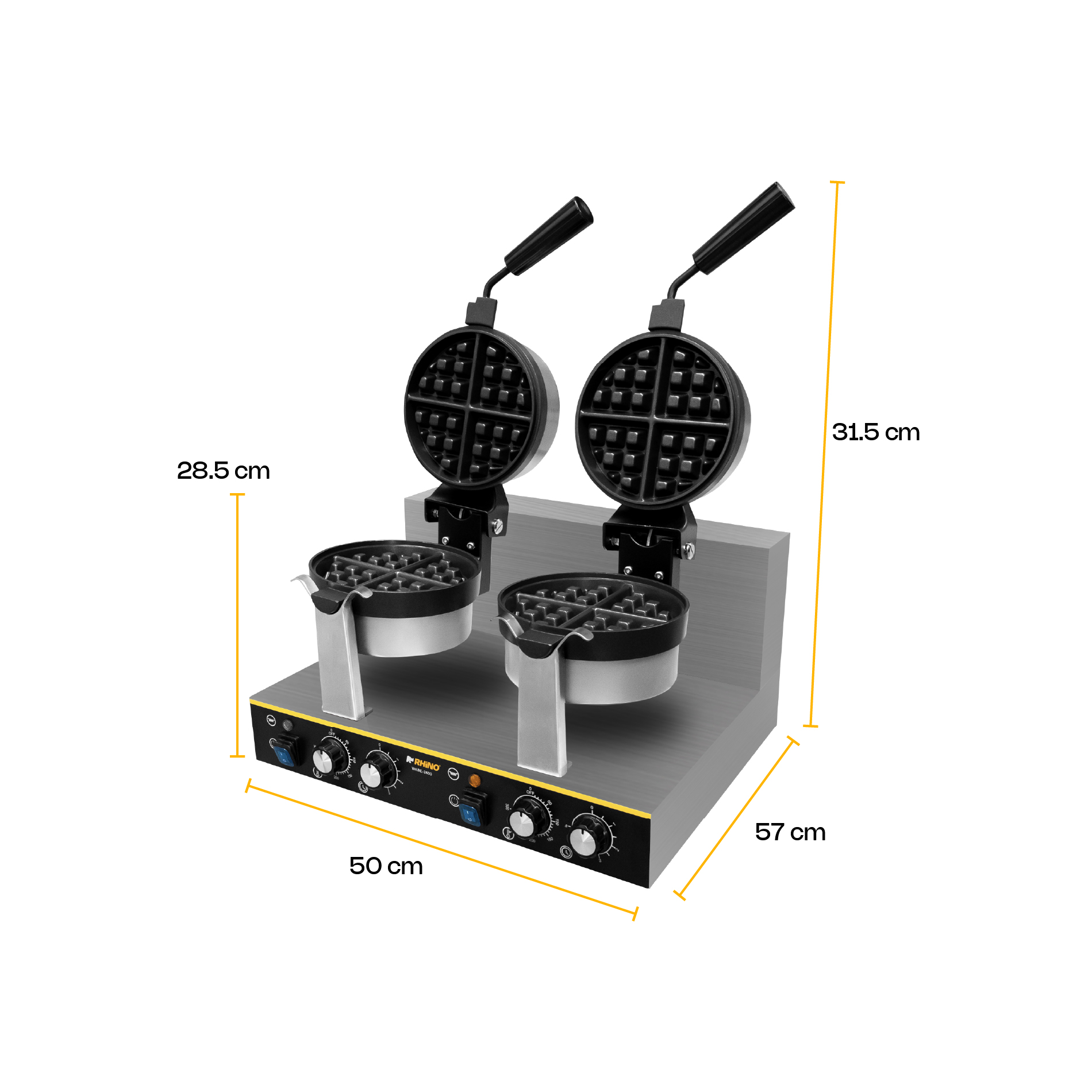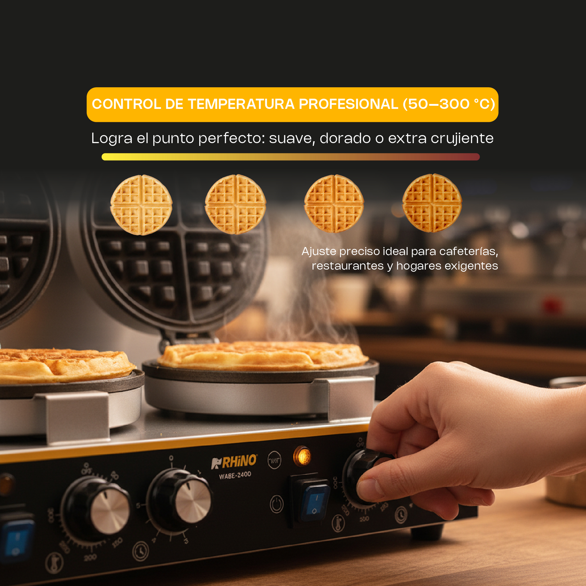 La WABE-2400 es una waflera belga giratoria doble diseñada para negocios con alta demanda que buscan rapidez, control y uniformidad en cada preparación. Su estructura de acero inoxidable y platos de hierro con recubrimiento de teflón antiadherente garantizan durabilidad, higiene y facilidad de limpieza.