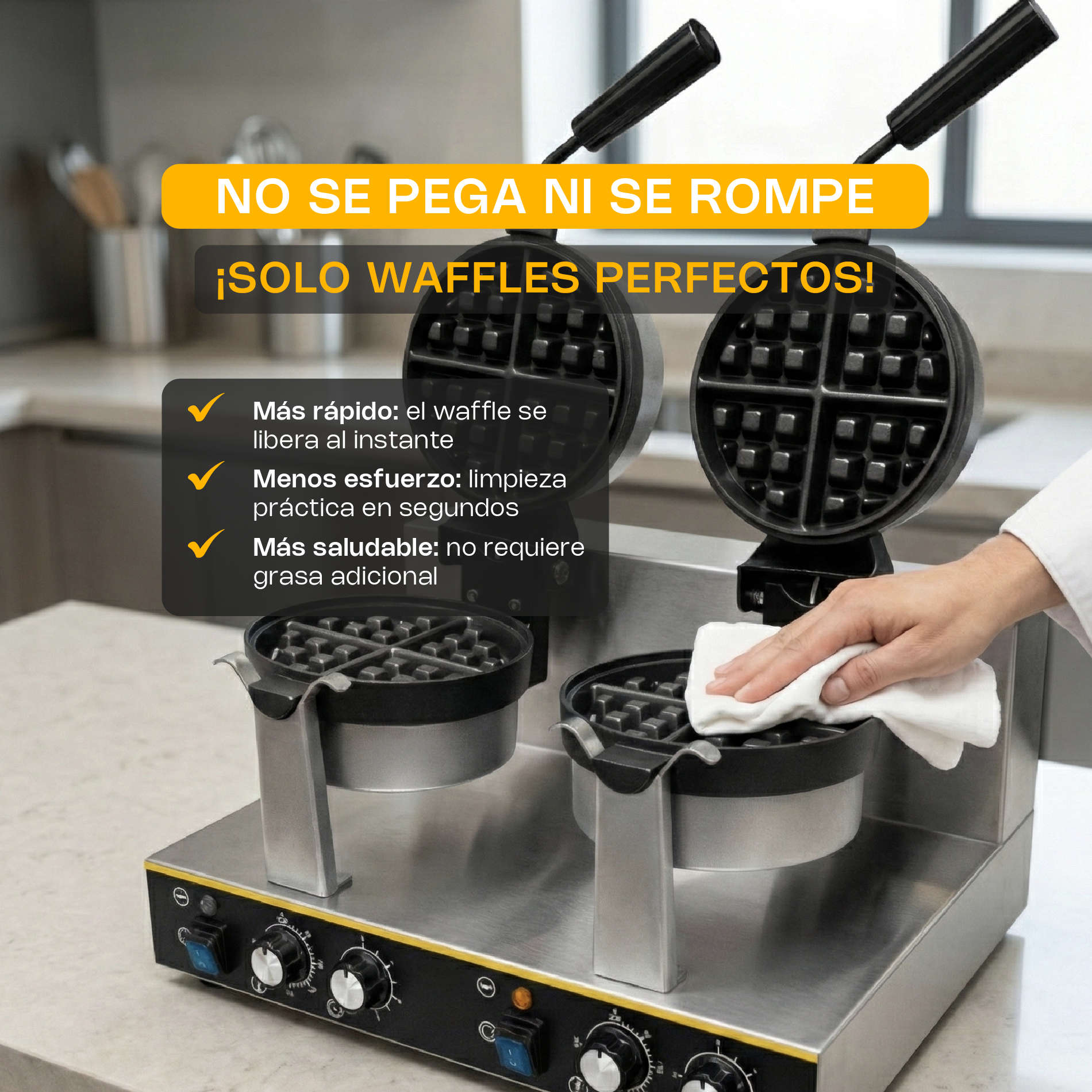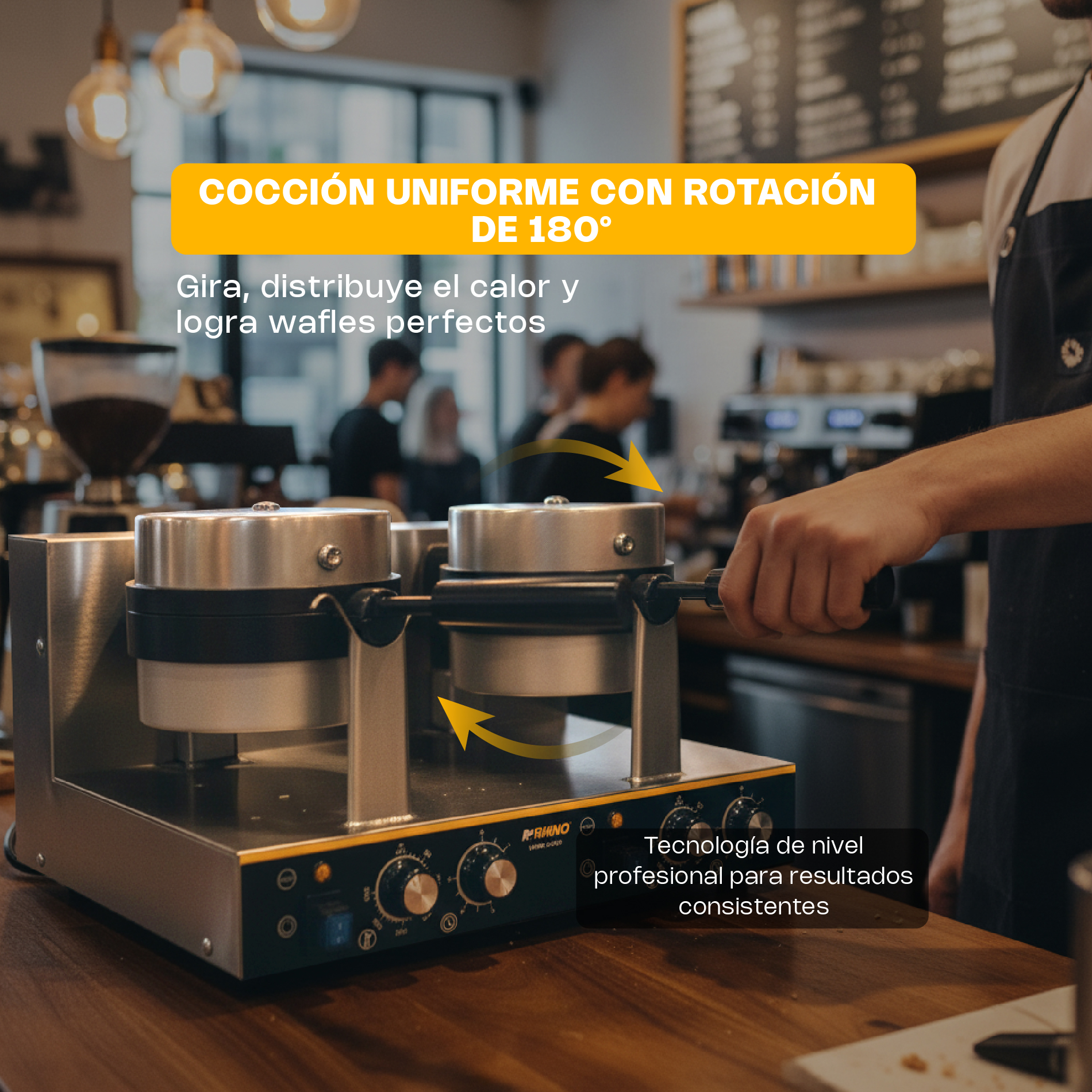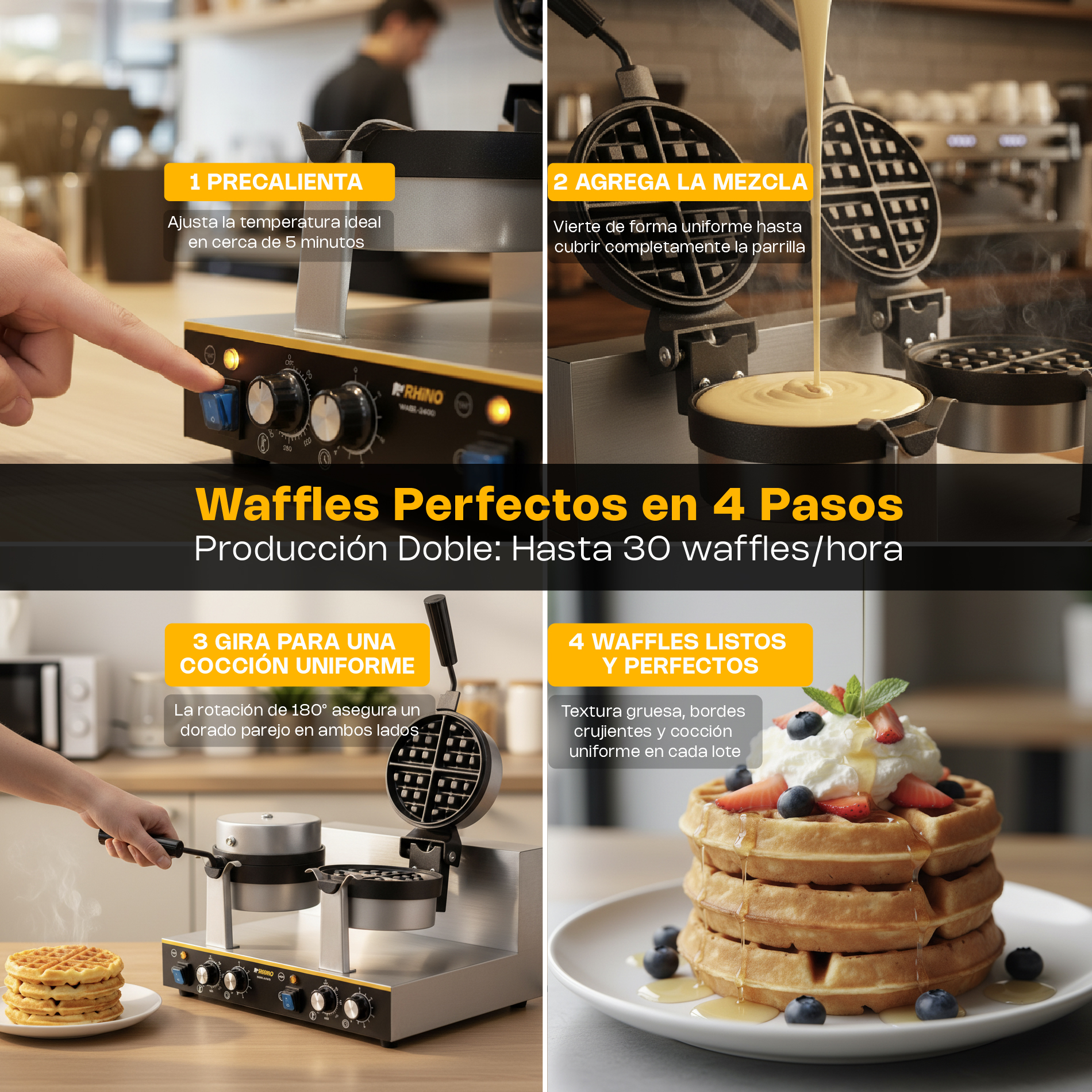 Doble cabezal giratorio de 180°: Distribuye la masa de manera uniforme para lograr waffles dorados y de textura perfecta.