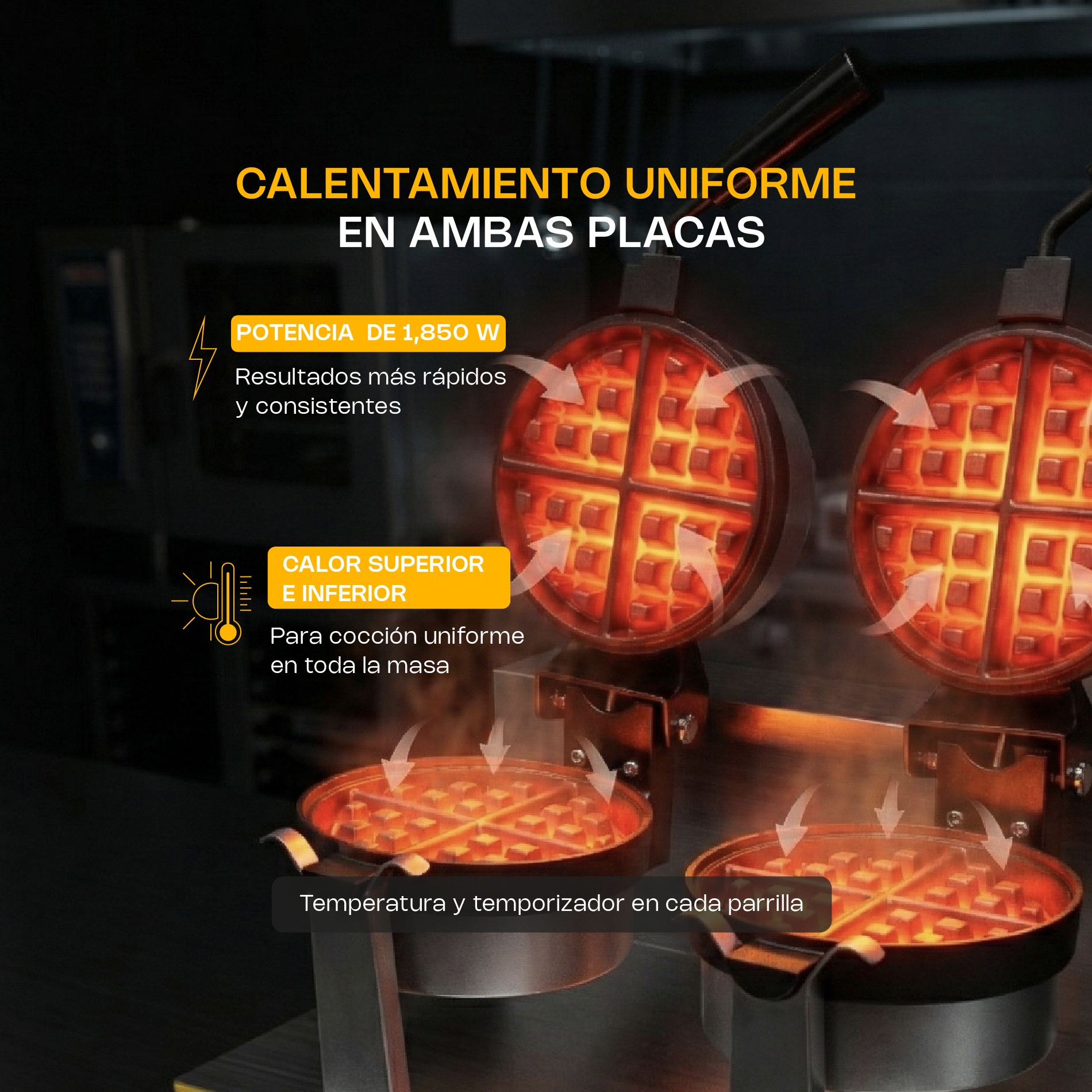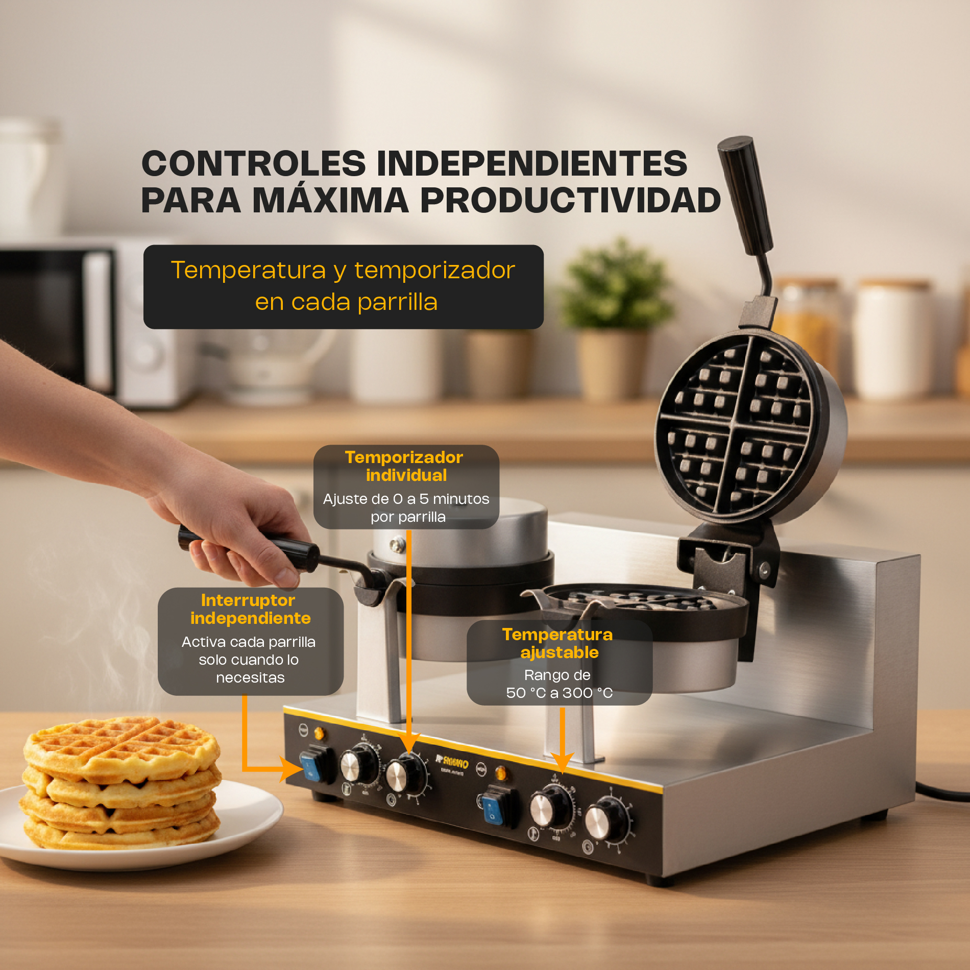 Su doble sistema de cocción independiente permite elaborar dos waffles al mismo tiempo con diferentes configuraciones, maximizando la productividad sin comprometer la calidad.